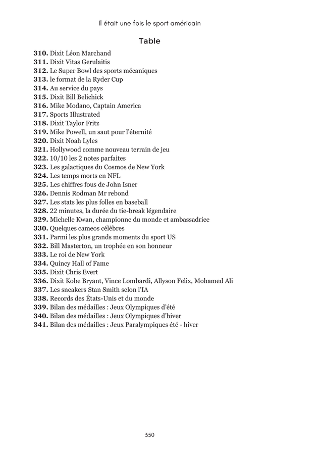 Une compilation d’histoires inspirantes, de biographies d’icônes du sport américain, de paroles de champions, d'essentiels et d'insolites. Aux côtés de superstars planétaires, vous croiserez certains athlètes oubliés et des échecs historiques.