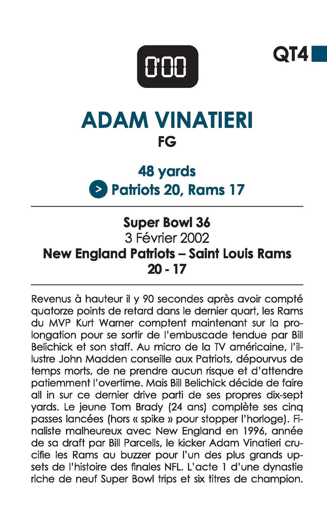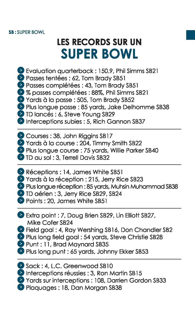La compilation ultime des meilleures actions de l'histoire du Super Bowl depuis sa création. Une compilation chronométrée des 100 plus grandes actions de l’histoire de la grande finale de la National Football League. Un livre au concept inédit qui se veut un compte à rebours lancé du coup d’envoi de la finale jusqu’à la dernière seconde du dernier quart temps. Le livre commence avec le safety scoré par Seattle après seulement douze secondes de jeu et se termine avec le touchdown de James White lors de l’unique prolongation de l’histoire du Super Bowl.